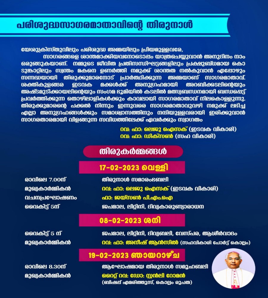 പരിശുദ്ധ സാഗര മാതാവിൻറെ തിരുനാൾ 17-02-23 വെള്ളിയാഴ്ച് മുതല് 19-02-23 ഞായറാഴ്ച വരെ