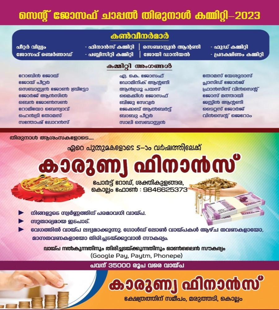 കൊല്ലം ശക്തികുളങ്ങര വളവിൽത്തോപ്പ് സെന്റ് ജോസഫ് ചാപ്പലിൽ 2023 മാർച്ച് 18, 19, 20 (ശനി, ഞായർ, തിങ്കൾ) വിശുദ്ധ യൗസേപ്പ് പിതാവിൻറെ തിരുനാൾ