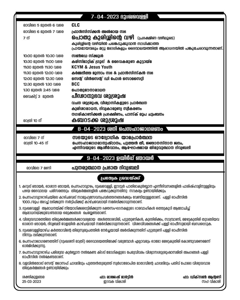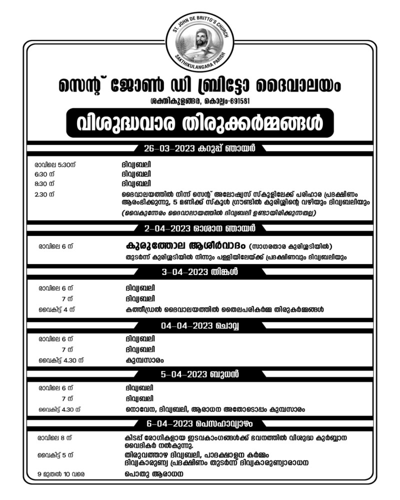 കൊല്ലം ശക്തികുളങ്ങര സെന്റ് ജോൺ ഡി ബ്രിട്ടോ ദൈവാലയത്തിലെ വിശുദ്ധവാര തിരുകർമ്മങ്ങൾ, 2023 മാർച്ച് 26 മുതൽ ഏപ്രിൽ 9 വരെ