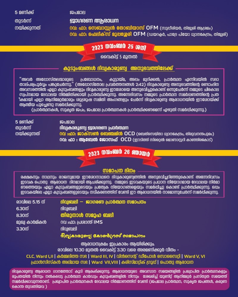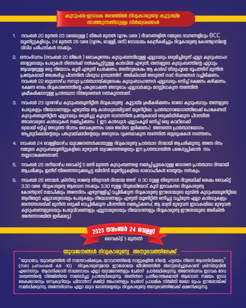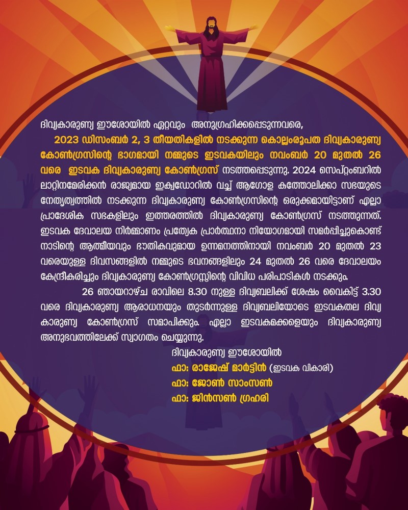 2023 ഡിസംബർ 2, 3 തീയതികളിൽ നടക്കുന്ന കൊല്ലംരൂപത ദിവ്യകാരുണ്യ കോൺഗ്രസിന്റെ ഭാഗമായി നമ്മുടെ ഇടവകയിലും നവംബർ 20 മുതൽ 26 വരെ ഇടവക ദിവ്യകാരുണ്യ കോൺഗ്രസ് നടത്തപ്പെടുന്നു.